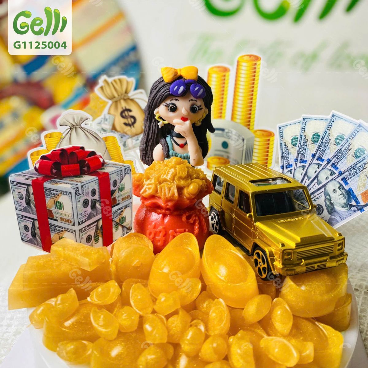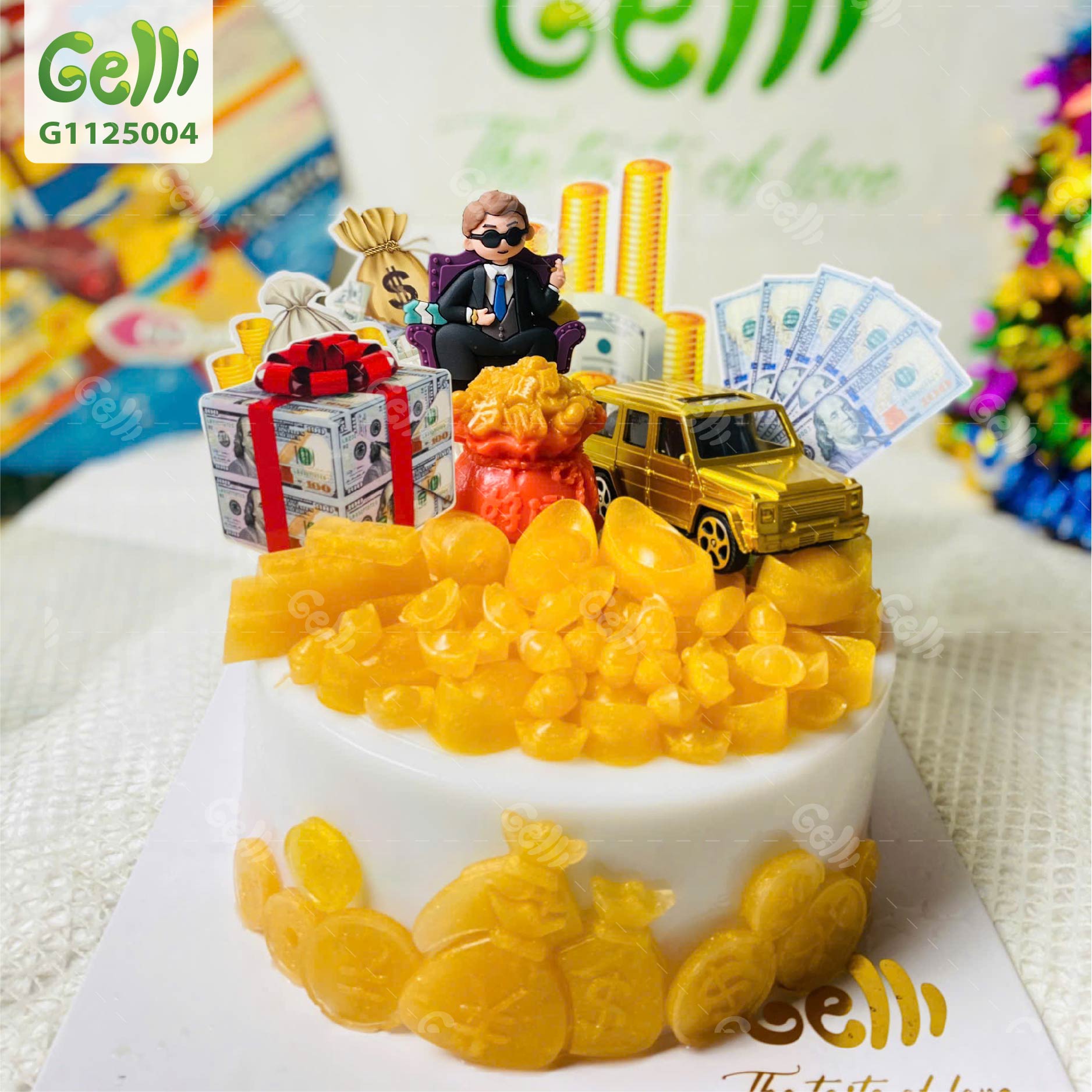 Bánh sinh nhật rau câu mã G1125004 với tạo hình tiền vàng, xe sang, và nhân flan dừa tươi – món quà ý nghĩa mang hồng phúc đến người nhận.
