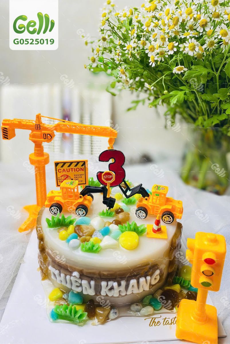 Mẫu bánh sinh nhật rau câu chủ đề công trình xây dựng G0525019 tại Gelli. Thiết kế xe công trình sinh động, làm theo tên & tuổi bé, vị flan và dừa tươi, nhiều size lựa chọn.