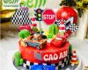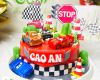 Chiếc bánh được tạo hình như một đường đua ô tô thu nhỏ, với đầy đủ cờ caro, biển báo STOP, đèn tín hiệu và các chi tiết đặc trưng trên đường đua. Nổi bật trên mặt bánh là những nhân vật hoạt hình Cars đình đám như Lightning McQueen, Mater và các bạn bè khác, khiến chiếc bánh trở nên sống động và gần gũi. Toàn bộ được phối hợp với tông đỏ – đen – trắng cá tính, mang đến cảm giác sôi động và cuốn hút, khiến bé như đang bước vào thế giới xe đua đầy thú vị.