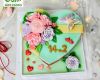 Thiết kế hình trái tim mềm mại, gam màu pastel dịu nhẹ kết hợp cùng những đóa hoa nổi thủ công, mang đến cảm giác tinh tế, lãng mạn và đầy cảm xúc. Trên nền bánh xanh mint thanh mát, các chi tiết hoa hồng, mẫu đơn được tạo hình tỉ mỉ, xen kẽ lá xanh và nơ vàng nhạt, gợi nên hình ảnh một món quà được gói ghém bằng sự nâng niu. Những trái tim nhỏ điểm xuyết quanh bánh như lời nhắn yêu thương giản dị nhưng sâu sắc.