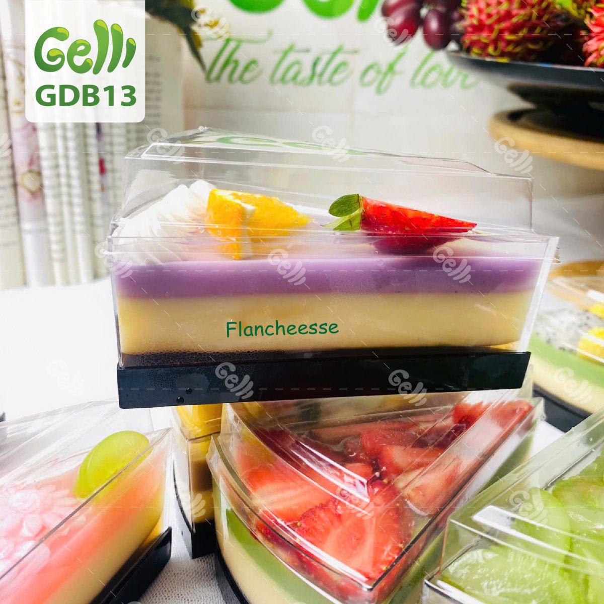 Thưởng thức Set Bánh Rau Câu Trái Cây Tươi Tam Giác GDB13, nhân flancheese béo mịn kết hợp trái cây tươi. Decor sang trọng, tiện lợi cho tiệc, hội họp và làm quà tặng.